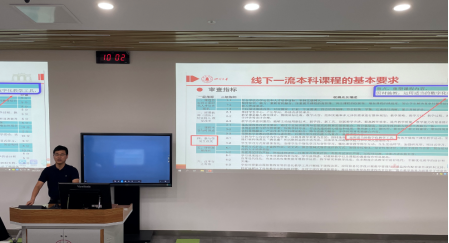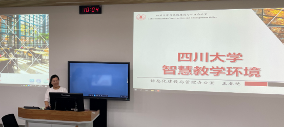 首先由杨为中老师介绍国家级/省级一流课程基本情况,希望各位教师利用现代信息化方式提升课程教学质量。随后四川大学信息化建设与管理办公室王春艳老师进行四川大学智慧教学环境介绍。王老师对校内智能研讨/报告型阶梯教室、多视窗互动教室、远程互动教室等8类教室和教学楼随处可见的互动交流空间进行详细说明,例如本次活动所在的基C104就是智能研讨型阶梯教室,座椅可360°旋转,桌边安装有电力轨道,配置有电子手写屏等功能,可以协助任课教师开展不同类型的课堂授课。王老师对每间教室安装的爱课堂软件进行介绍,特别是对课堂签到、随堂测验、资料下发、弹幕等等功能阐述。