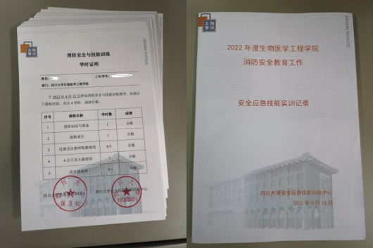 4月27日,同学们还收到了四川大学保卫处和安全应急技能训练中心送来的《消防安全与技能学时证明》和《安全应急技能实训记录》,在惊喜的同时,90足球网