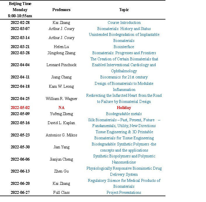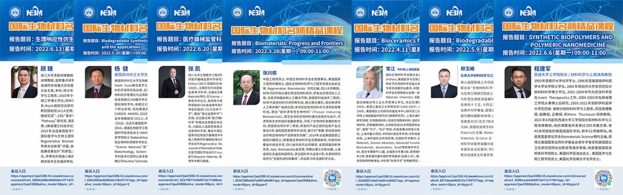 开设的《国际生物材料名师精品课程》由张兴栋院士亲自倡议和部署,在主管教学的副院长林江莉教授的大力支持下,由张凯教授担任课程负责人,具体组织实施,采用线上教学进行,面向国内生物材料领域研究生及学者开设。