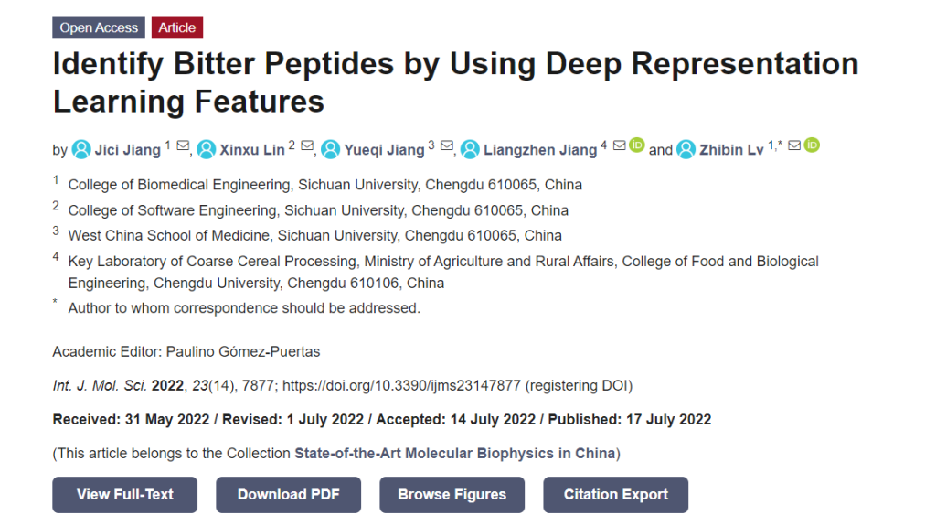 2020级本科生蒋济慈负责的大创团队科研成果“Identify Bitter Peptides by Using Deep Representation Learning Features”在《International Journal of Molecular Sciences》在线发表(全文链接://www.mdpi.com/1422-0067/23/14/7877)。