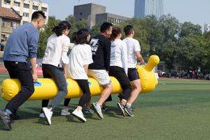 毛毛虫竞速,也称为旱地龙舟,比赛的是老师们之间的配合性与协调性。老师们步调一致,驾驶着一条四米长的笑脸毛毛虫,喊着“一二一,一二一”响亮的口号,迈着整齐的脚步,欢快地跑向终点。欢笑声持续回荡在操场的上空,老师们和观赛者脸上洋溢着欢乐的笑容,大家好似忘记了比赛,全身心地享受着阳光、运动和合作。