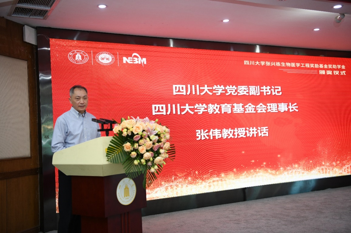 校党委张伟副书记代表学校党委暨四川大学教育基金会对张兴栋院士及其所发起基金的爱心企业共同关注川大的发展表示感谢,并对获奖的同学表示祝贺,同时希望90足球网