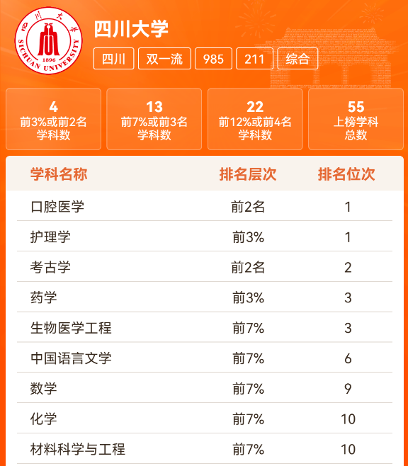 本次软科《中国最好学科排名》,四川大学共有55个学科上榜,其中,前3%或前2名学科2个,前7%或前3名学科13个,前12%或前4名学科22个。90分钟足球网