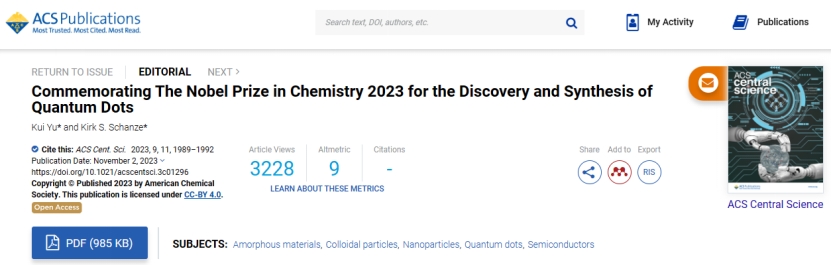 余睽教授应2022年诺贝尔化学奖“点击化学和生物正交化学”获得者Carolyn R. Bertozzi邀请,和Kirk S. Schanze教授(ACS Appl. Mater. Interfaces主编)于2023年在美国化学会期刊ACS CentralScience上发表专文“Commemorating The Nobel Prize in Chemistry2023 for the Discovery and Synthesis ofQuantum Dots”,介绍2023年诺贝尔化学奖量子点的发现和合成(ACS Cent. Sci.2023,9, 1989−1992)。