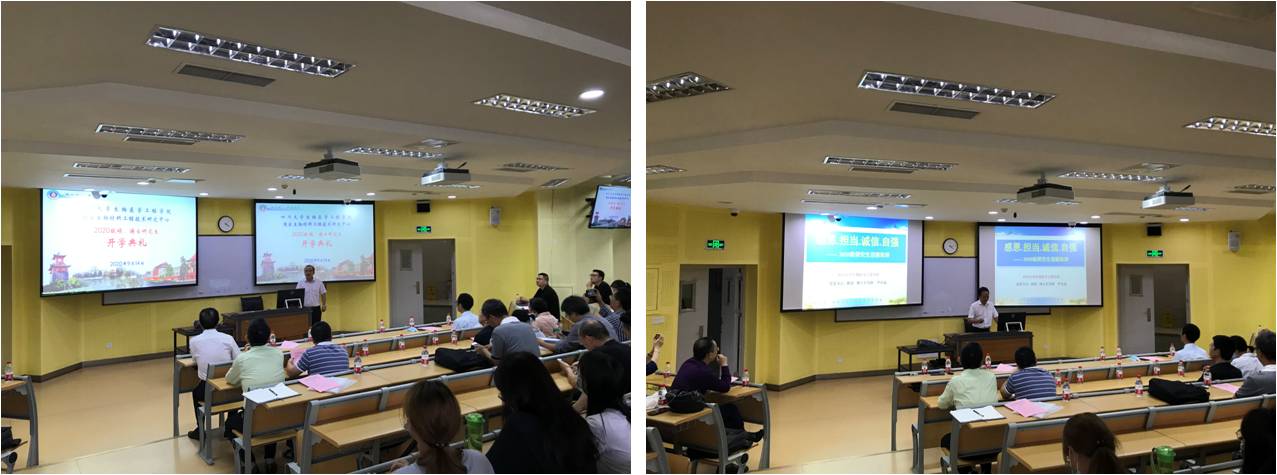 2020914日下午,90足球网-90分钟足球网 2020级硕、博士研究生开学典礼在我校研究生院水上报告厅举行。90足球网 党委书记尹光福教授、院长赵长生教授、党委副书记田单、副院长林江莉教授、副院长林云锋教授,国家生物医学材料工程技术研究中心主任王云兵教授、副主任范红松教授,研究生导师代表等30余位教职工以及2020级全体硕、博士研究生119人(其中博士43人,硕士76人)参加了典礼。