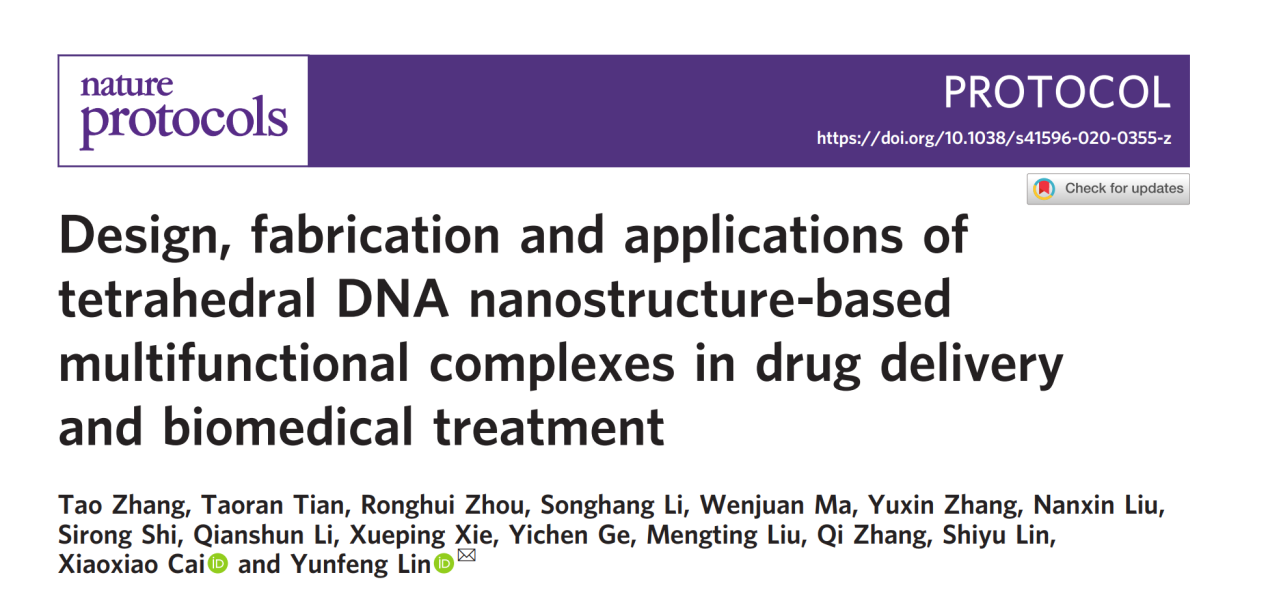 的林云锋教授团队,在国际前沿期刊《Nature Protocols》上发表了题为“Design, fabrication and applications of tetrahedral DNA nanostructure-based multifunctional complexes in drug delivery and biomedical treatment”的论文。四川大学为该论文的唯一单位,张陶博士后为该论文的第一作者,林云锋教授为唯一通讯作者。